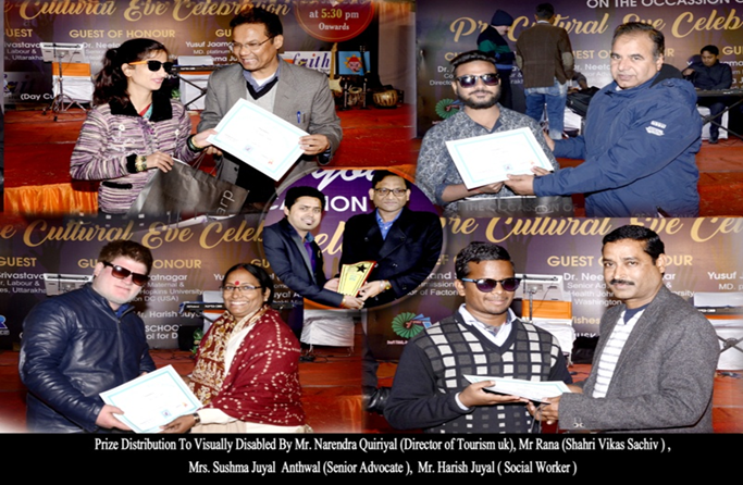 MDR Society and MUSKAAN School on the occasion of Independence day and Republic day conducted pre cultural eve on 14th of August and 25th January respectively at different venues. In the event visually disabled persons and children of muskaan school performed in various spheres like, singing, dancing, poetry etc., and their performances were highly appreciated by the Honoured guests Mr. Anand Srivastva( Labour Commissioner) Mr. Narendra Kudiyal(Director of Tourism) Mr. Hira Singh Bisht(MLA/Ex Minister UK) and entire audience.